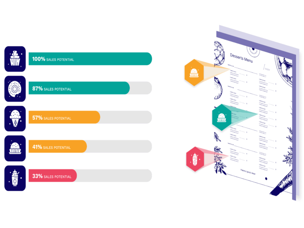 Calcula el potencial de venta de cada cliente, por afinidad del porfolio con la oferta gastronómica de cada local. Nuestro motor de inteligencia artificial analiza cada establecimiento para calcular el impacto que puede tener tu portafolio de productos en su carta, permitiéndote dirigir tus esfuerzos comerciales de manera más eficiente.