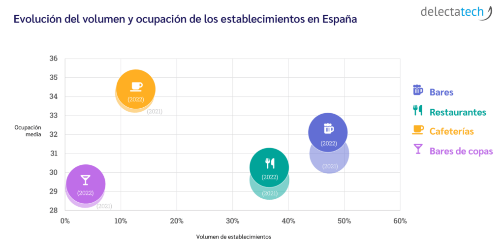 Cafés are the clear winners in terms of total occupancy. They record an average occupancy of 34.39% and have grown by 2.8 percentage points, marking an excellent year for them. Bars, besides being the most numerous, rank second in occupancy with 32.1%, also showing the highest growth compared to last year at +3.6%.