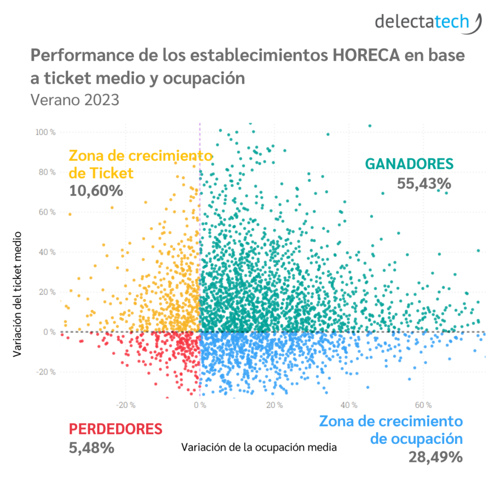 The highest concentration of establishments that increased both occupancy and average ticket is located in northern Spain: La Rioja, Cantabria, and Asturias. Conversely, regions with the highest density of establishments, such as the Community of Madrid, Catalonia, Andalusia, and Extremadura, saw decreases in both indicators.