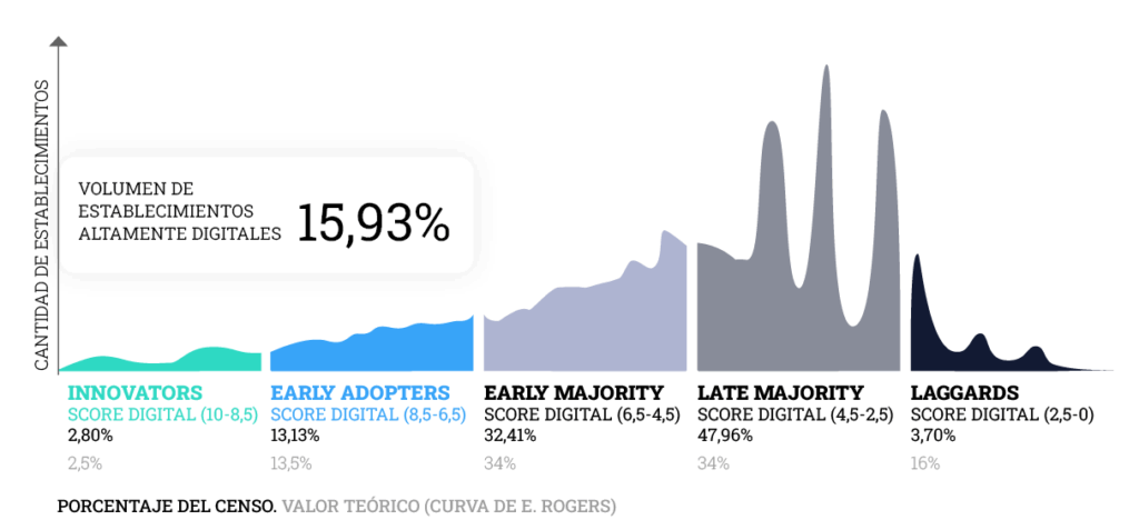 One of the first conclusions relates to the volume of Highly Digitalized Establishments. This group represents 15.93% of all establishments and is known as “Innovators” and “Early Adopters,” due to their strong commitment to new technologies and anticipation of customer needs regarding digital experience.