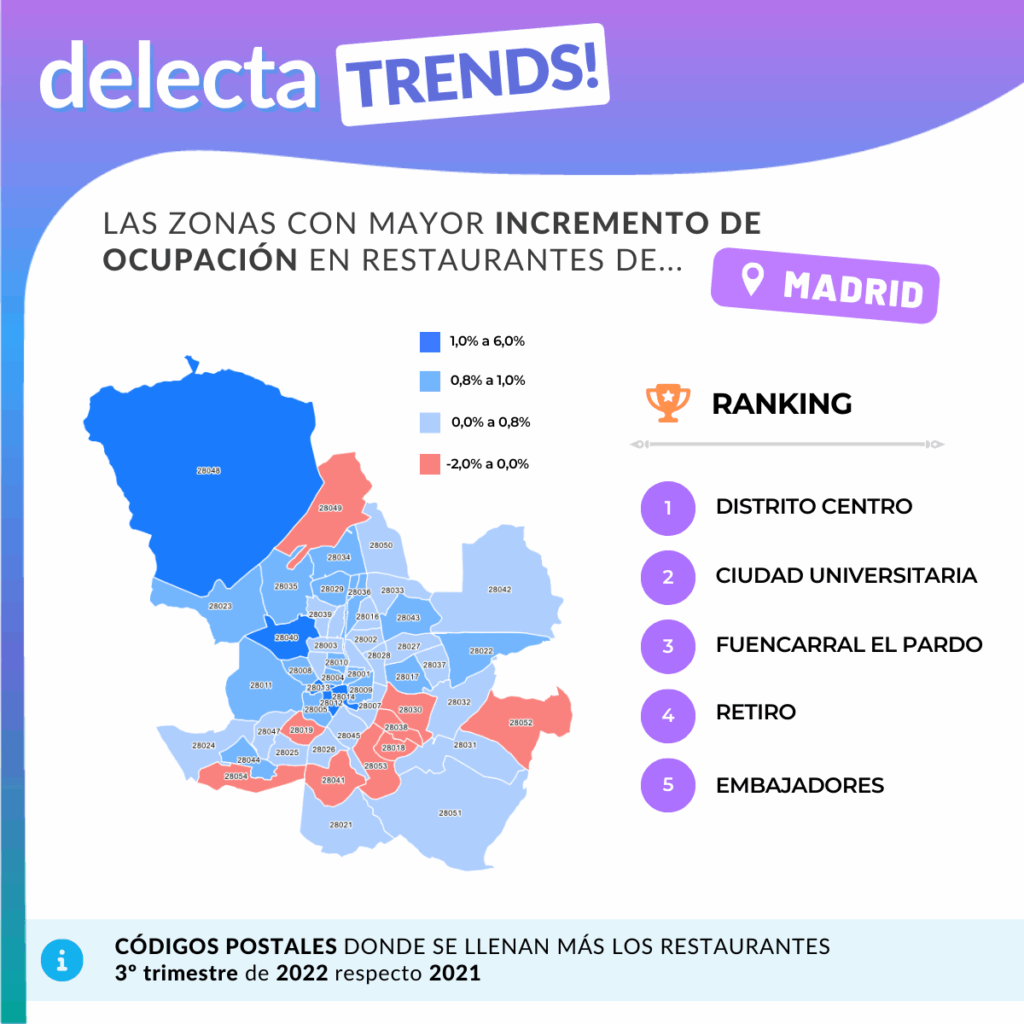 Los datos obtenidos nos dicen que el mayor incremento de ocupación se da en los restaurantes de la zona centro, especialmente en los alrededores del Palacio Real. Esta zona es una de las más frecuentadas por turistas.