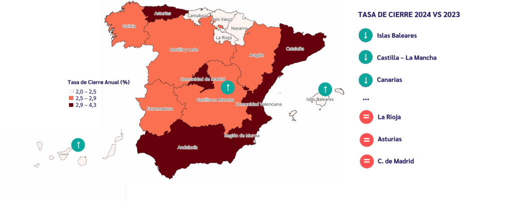 Las zonas con el mayor número de cierres este 2024 han sido la Comunidad de Madrid, Cataluña, la Comunidad Valenciana y la Región de Murcia.