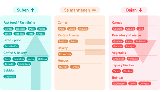 • En bebidas, crecen la relevancia del café, tés y cócteles, mientras las bebidas alcohólicas tradicionales como vinos y cervezas bajan en popularidad, reflejando un cambio hacia opciones más saludables y nuevas tendencias de consumo.